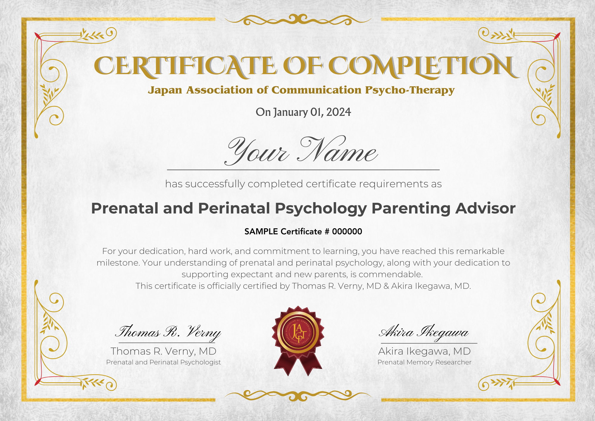そして最後になりますが、講座の修了者には、トマス・バーニー博士の出生前・周産期心理学を学んだ証として、出生前・周産期心理学アドバイザーの認定を授与しています。ぜひあなたのキャリアに活かしていただければ幸いです。